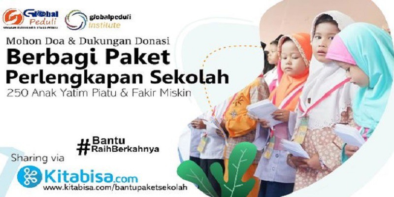 Yayasan Globalindo Utama Peduli & globalpeduli Institute ingin mengajak Bapak/Ibu/Saudara sekalian untuk berbagi memberikan paket sekolah untuk adik-adik Panti Asuhan, Anak Yatim Piatu, Fakir Miskin & Dhuafah yang tersebar di wilayah Lamongan, Gresik & Tuban agar mereka dapat belajar dengan layak demi masa depan lebih baik. Rencana Penggunaan Dana Donasi Target Donasi : Rp. 250.000.000 Penerima : 250 Anak Yatim Piatu, Fakir Miskin & Dhuafa